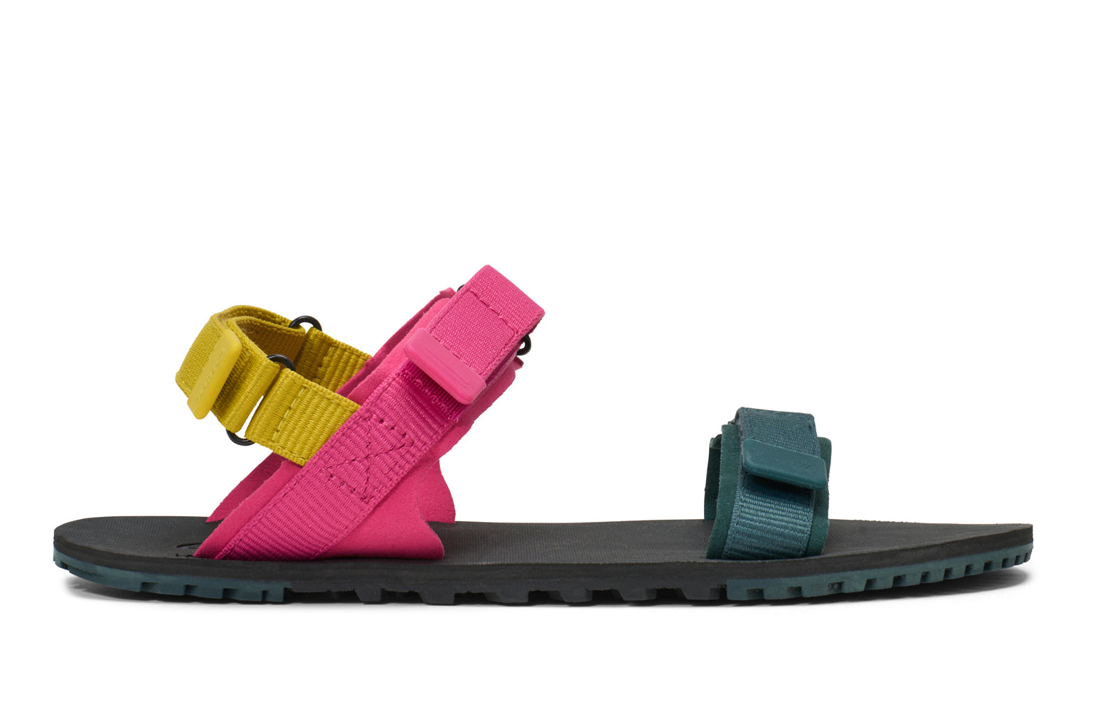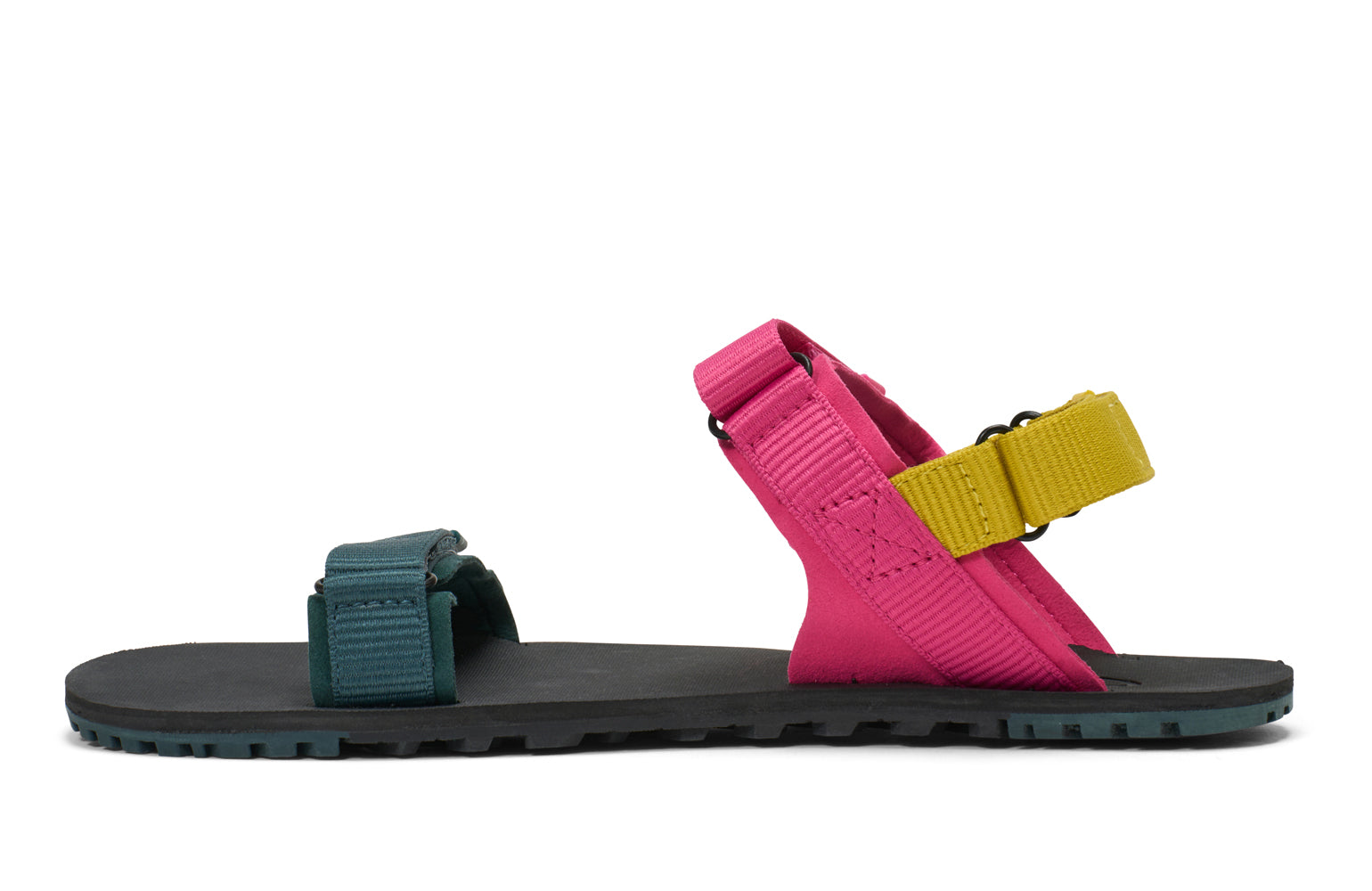 The D-Trail trail to town minimal sandal in Black/Asphalt features an 11mm lightly cushioned sole made up of a 4mm BareFoam™ footbed and a 4mm FeelTrue™ outsole with an updated dual chevron 3mm lug pattern that offers the best combination of comfort, protection, and trail-to-town ready traction while still allowing you to bend, move, flex, and feel the terrain beneath your feet all while being smart enough for heading into town to grab a coffee with friends.