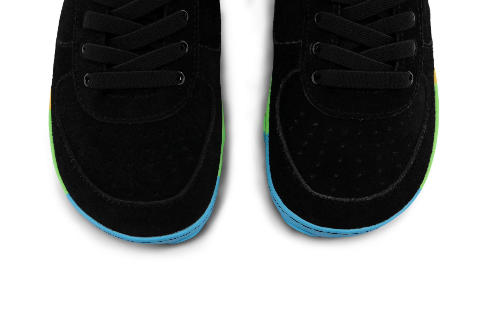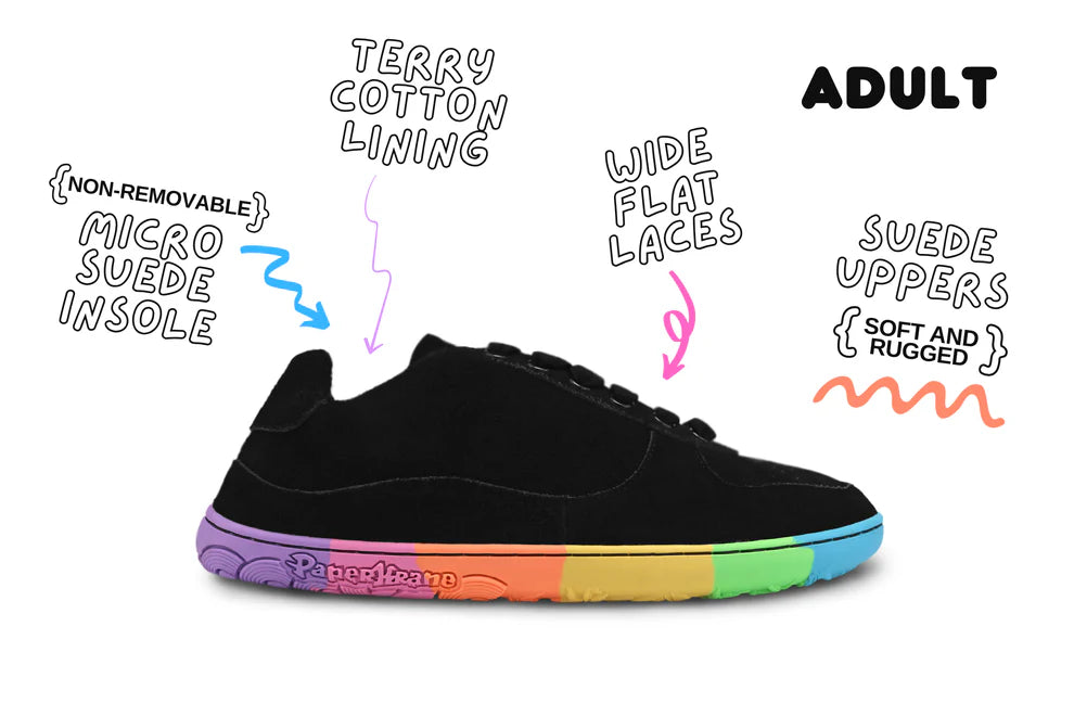 Crafted with our foot-shaped design and flexible construction, they're made from our super soft black suede (leather), this style features terry cotton lining, micro-suede lined foam inner soles, and a classic tie-up laces for adults (or elastic laces for kids sizes 30-36), all layered on top of our signature RAINBOW rubber soles.